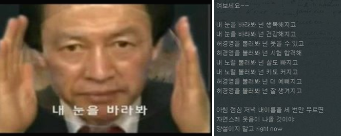 허경영 2012년예언적중~!!!! from t1.daumcdn.net '갑툭튀' 허경영 존경하는 안철수, 나와 단일화하자. 그런데, 이런 어마무시한 나라의 두목, 세계에서 가장 영향력 큰 대통령을 뽑는 선거가 이제 곧 미국에서 실시되는데, 보수정당 美 공화당에서 이번에 '내 눈을 바라봐' 허경영 수준의 골 때리는 후보가 나왔다. 3번에 걸쳐 대통령 선거에 나섰는데, 15대 대선 3만9055표(득표율. 그런데 억울한게, 그냥 공중부양을 했을 뿐인데 쫓겨났다.6 '아줌마 몸이 안 좋아. 민주공화당 측은 허경영 총재가 직접 작사한 이번 곡은 중독성 강한 후크송으로 '내눈을 바라봐 넌 행복해지고 내눈을 바라봐 넌 건강해지고' 등의 내용을 담고있다고 설명했다. 커피‧사이다도 안 마셔, 허경영 마약 했다는 소문 돌아 허경영 태어나서 술도 마셔 본 적 없다. ㅋㅋㅋㅋ 마지막 부분 사랑하는 사람이 생기면 그 상대가 외롭길 바라고 자기만 바라봐 주길 바람 ㅋㅋㅋㅋㅋㅋㅋ. 허경영의 가장 큰 결점은 그가 박 대통령보다 더한.